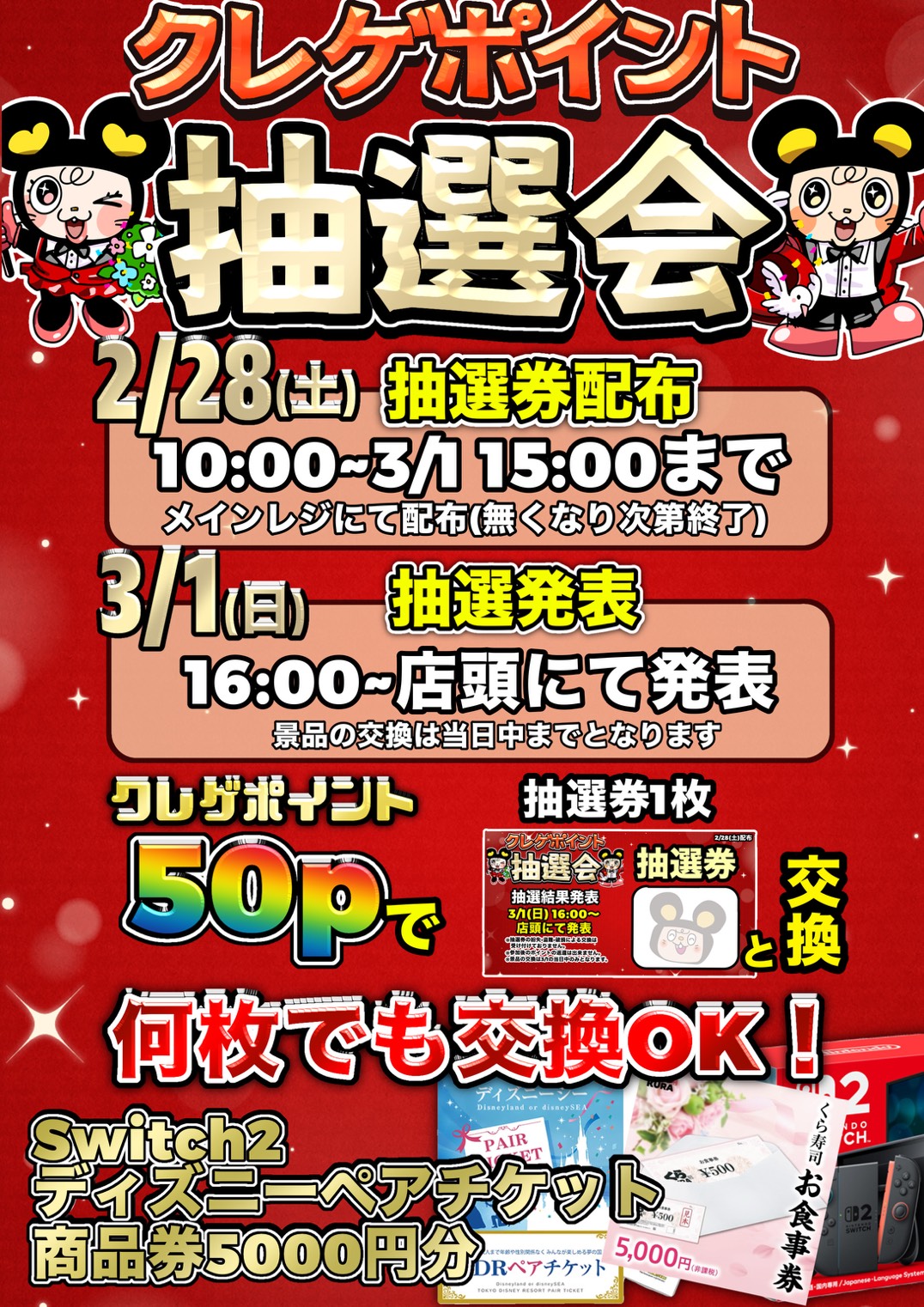 クレゲポイント抽選会開催‼️ 開催期間2/28(土)•3/1(日) …