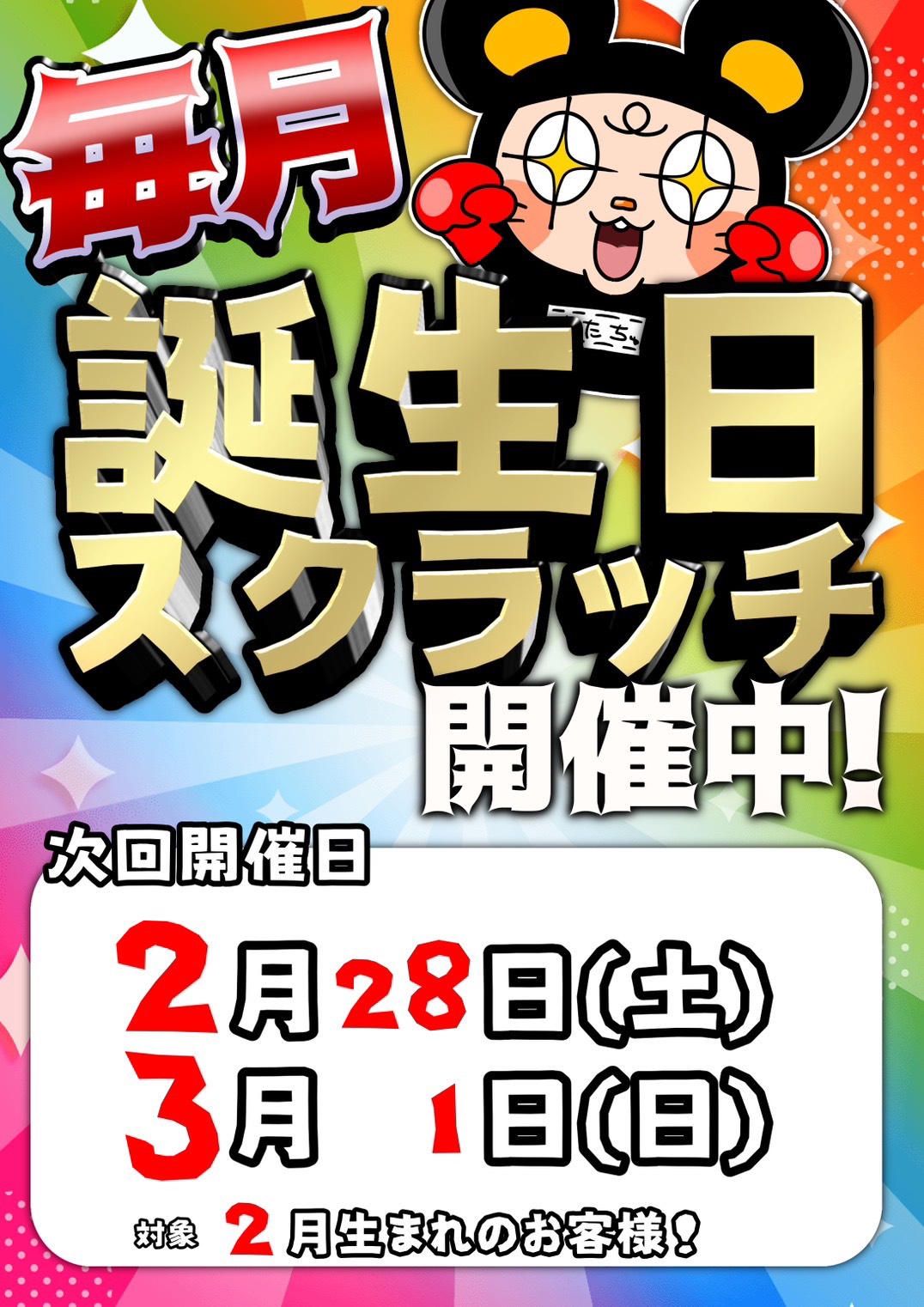 バースデースクラッチ開催‼️ 開催期間2月28日(土)・3月1…