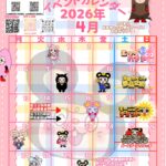 PREV2026年 4月NEXT日月火水木金土2930311234台湾キャッチャーイベントエッグハントバースデースクラッチ567891011エッグハント来店ポイント景品交換■エッグハント■12131415161718来店ポイント景品交換モーニングチケット19202122232425モーニングチケットセルフビンゴ&バースデースクラッチ262728293012セルフビンゴ&バースデースクラッチ 【イベント一覧】 その他イベント来店ポイント景品交換開催日: 2026年4月11日 - 2026年4月12日その他イベントモーニングチケット開催日: 2026年4月18日 - 2026年4月19日その他イベントセルフビンゴ&バースデースクラッチ開催日: 2026年4月25日 - 2026年4月26日