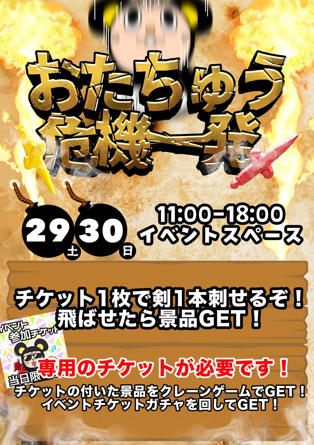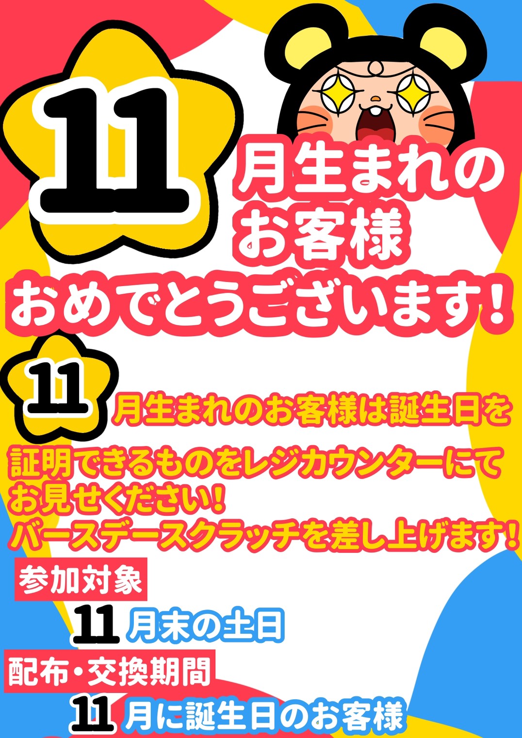 ☆★《11月29日、30日》【ドキドキ‼️】おたちゅう危機一発|バースデースクラッチ11月開催‼️★☆ イベント 2025年11月29日 【ドキドキ‼️】おたちゅう危機一発開催 開催期間11月29日(土)・30日(日) 開催時間11:00~18:00 ____________________ バースデースクラッチ11月開催‼️ 開催期間11月29日(土)・30日(日) 参加対象 11月生まれのお客様! お誕生日を証明できるものをお持ちになってレジまでお越しください!素敵なプレゼントが当たるかも…? Post Views: 41
