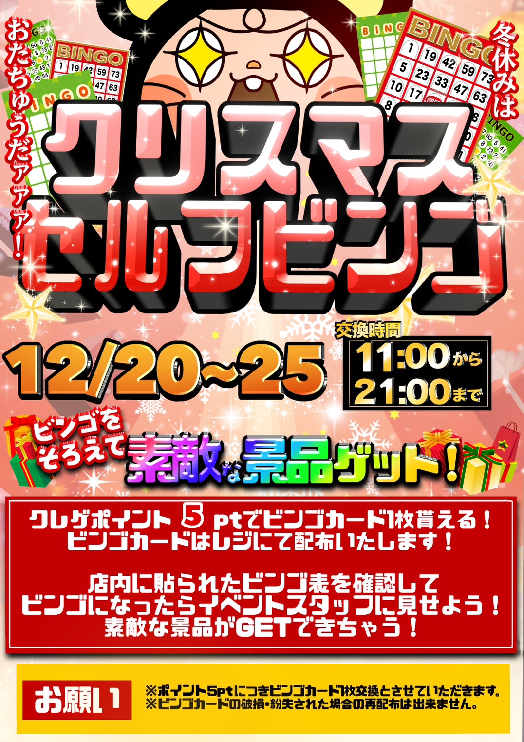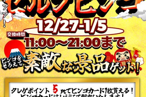 ☆★《12/20~25》【🎅】クリスマスセルフビンゴ開催‼️★☆ イベント 2025年12月10日 ★イベント情報★ 【🎅】クリスマスセルフビンゴ開催‼️ 開催期間12月20日(土)~25日(木) 開催時間11:00~21:00 Post Views: 14