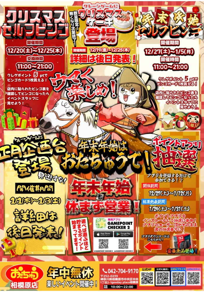 ✨《12月20日~1月12日》年末年始イベント情報✨ イベント 2025年12月22日 ✨年始イベント情報✨ 🎉クリスマスセルフビンゴ🎉 開催日時:12月20日~25日 交換時間:11時~21時 🎉クリスマスケーキ登場🎉 開催日時:12月19日~25日※数量限定無くなり次第終了 🎉年末年始セルフビンゴ🎉 開催日時:12月27日~1月5日 11時~21時 🎉クレーンゲーム正月企画台🎉 開催日時:1月1日~3日 🎉ポイントアプリ抽選🎉 開催日時:12月27日~1月12日 結果発表:1月24日~31日 Post Views: 25