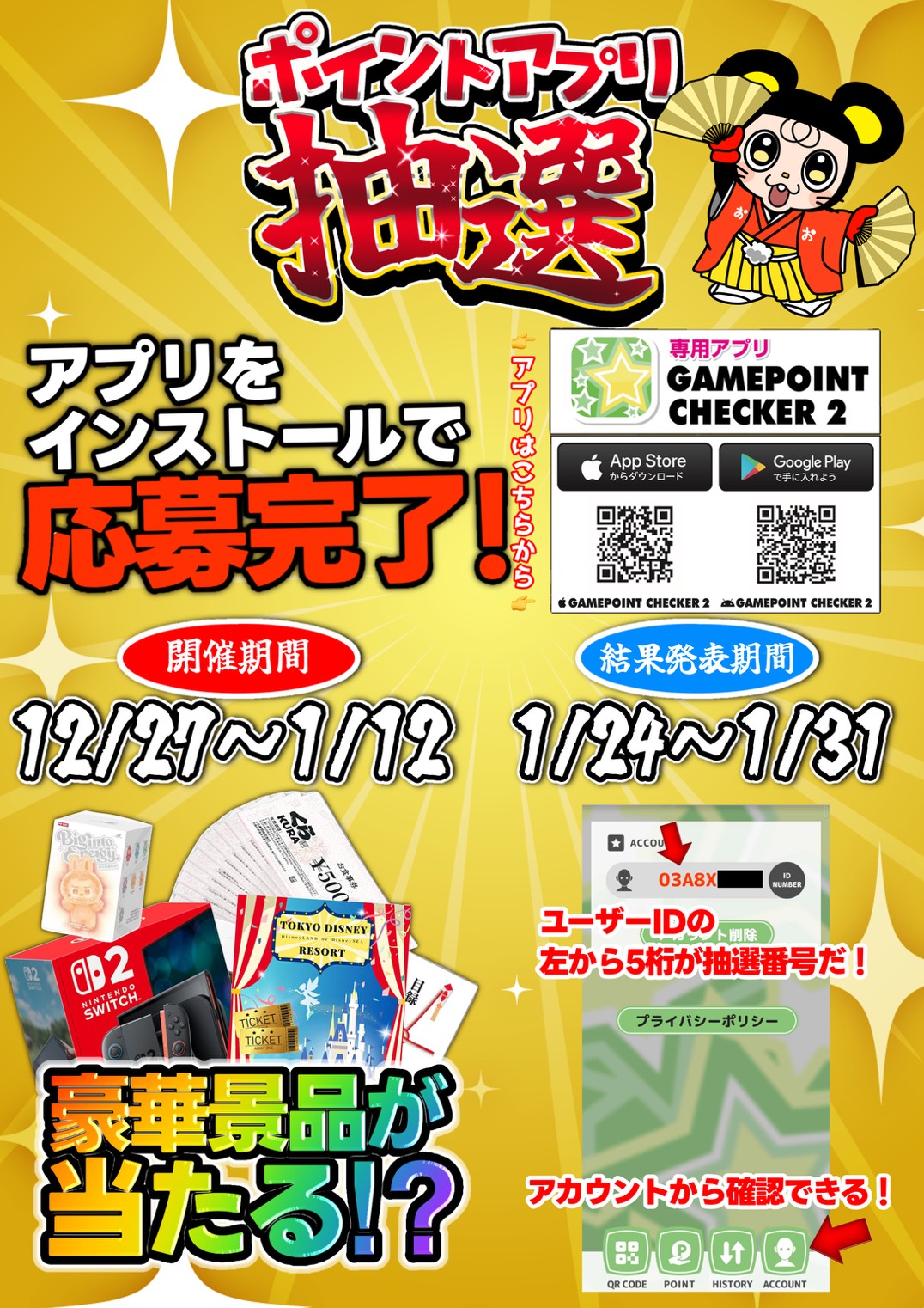 【12月27日(土)~1月12日(月)】ポイントアプリ抽選開催‼️ イベント 2025年12月27日 ポイントアプリ抽選開催‼️ 開催期間12月27日(土)~1月12日(月) 結果発表期間1月24日(土)~1月31日(土) ポイントアプリを登録するだけで参加できちゃう‼ 豪華景品が当たるかも…⁉ Post Views: 20