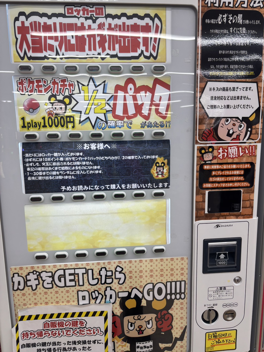【❗️カード自販機リニューアル❗️】 カード ガチャ入荷情報 2025年12月9日 『ポケカ自販機』がリニューアル‼️ ニブイチでパックが当たるかも!!? 大当たりにはロッカー鍵が当たります🎯 場所は店内を入って左側の黄金ガチャの隣にあります✨ 皆さまのご来店お待ちしております✨️ Post Views: 51