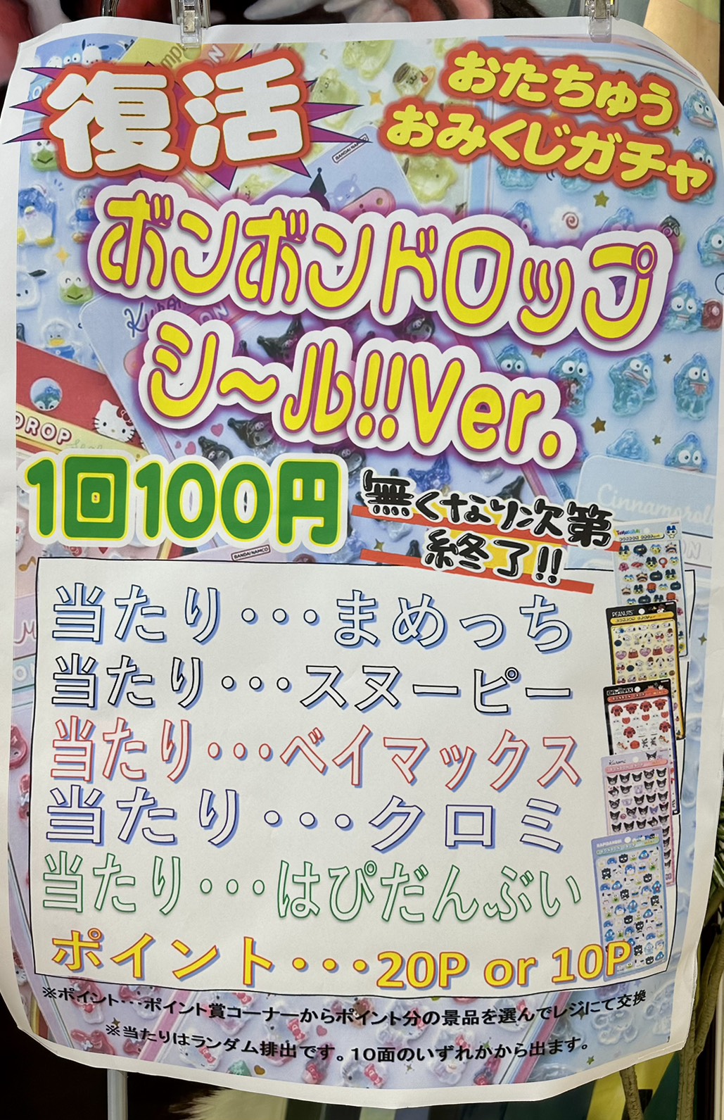 【おたちゅうおみくじガチャ✨】 ガチャ入荷情報 2026年2月20日 【おたちゅうおみくじガチャ✨】 ✩.*˚お待たせいたしました~.ᐟ.ᐟ 『おたちゅうおみくじガチャ・ボンボンドロップシールver.』が本日より 『復活‼️ボンボンドロップシールver.』としてスタートしました‼️🤩 どのシールが当たるかは、ガチャを回してからのお楽しみ…🤫💞 ⚠️無くなり次第終了となります。 ⚠️要注意事項をお守り頂くよう、ご協力お願い申し上げます。 皆さまのご来店お待ちしております✨️ Post Views: 38