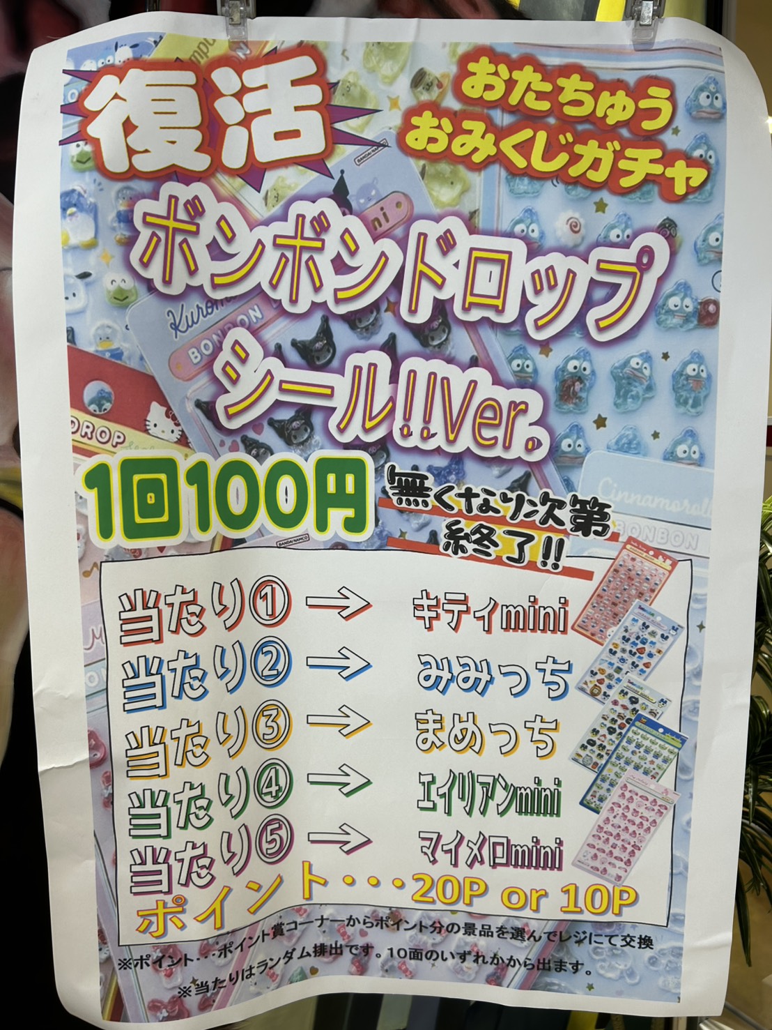 【おたちゅうおみくじガチャ✨】 ガチャ入荷情報 2026年2月23日 『復活‼️ボンボンドロップシールver.』 入れ替えしました〜❣️😍 当たりシールが変わってるので、見てみてね👀💕 どのシールが当たるかは、ガチャを回してからのお楽しみ…🤫💞 ⚠️無くなり次第終了となります。 ⚠️要注意事項をお守り頂くよう、ご協力お願い申し上げます。 皆さまのご来店お待ちしております✨️ Post Views: 24